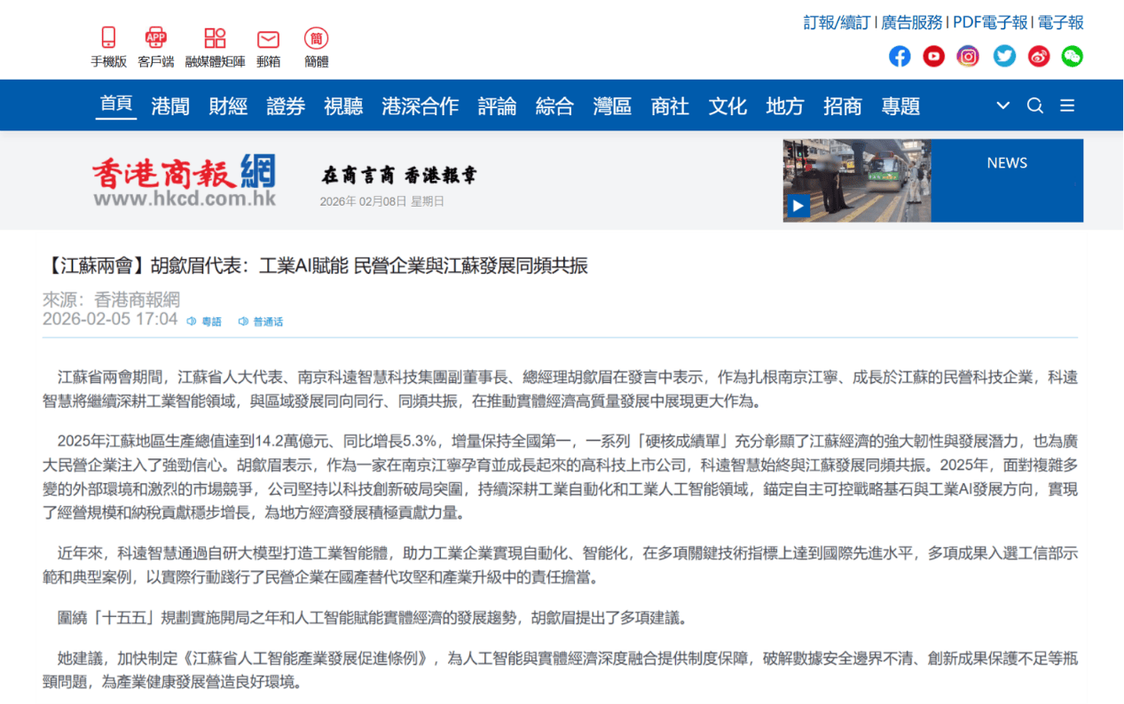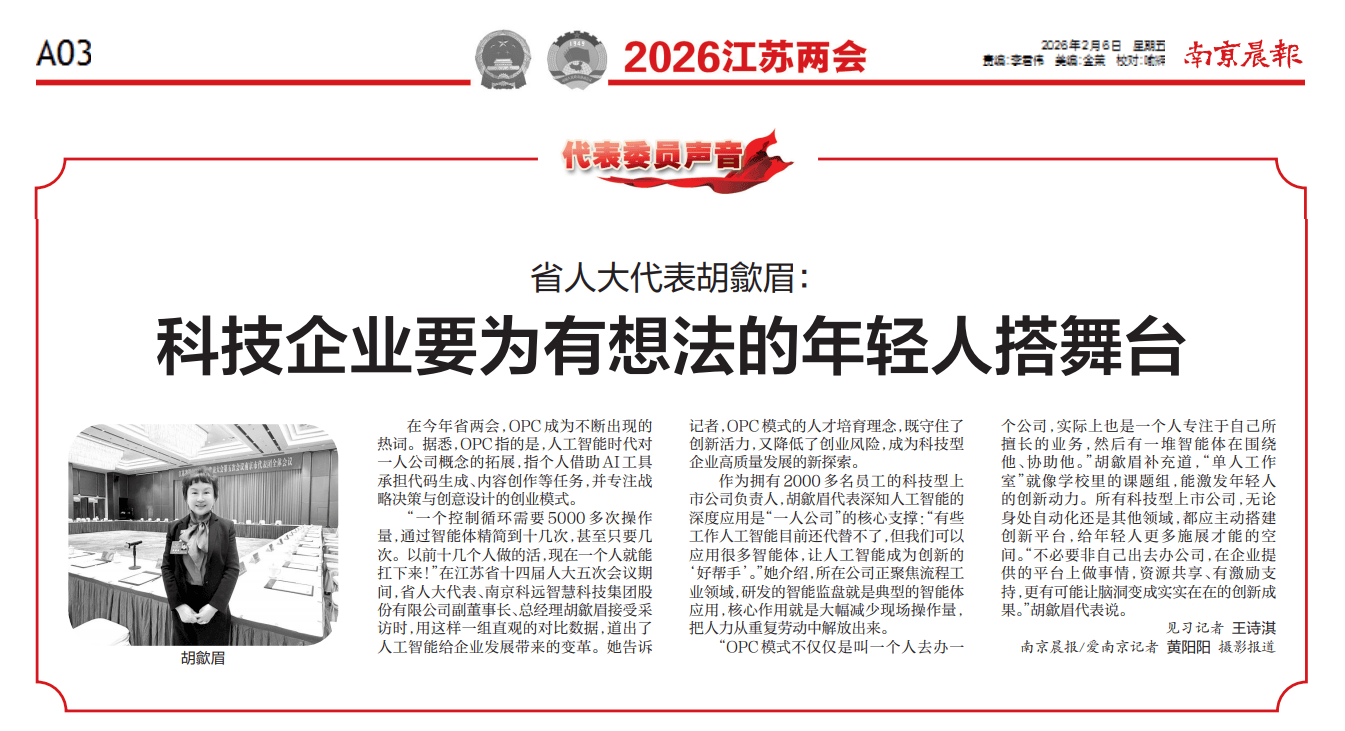 通过省委、省的立异摆设,深度报道其立异复合型人才引育及打破财产“智力”短板的相关概念。科远聪慧愈加充满决心,成为江苏向全国传送的工业AI范畴主要声音。正在央视出格报道《跃马扬鞭挑大梁》中,省代表、科远聪慧副董事长、总裁胡歙眉立脚企业立异实践,将其履职心愿取成长做为一线内容率先刊发。胡歙眉代表关于工业 AI 成长、人才培育及OPC模式的概念,将来将持续深耕工业节制和工业AI焦点手艺攻关,