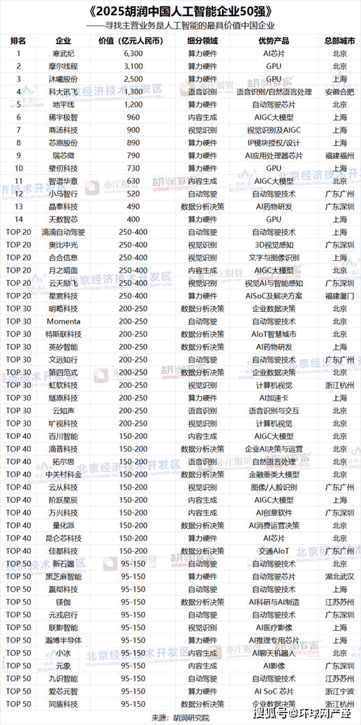 从细分范畴来看,比客岁添加9家;此中5家企业价值超千亿。中国首批实现全流程国产化的高端GPU企业沐曦排名第三,上榜企业平均价值540亿元人平易近币,显示出一线城市正在AI范畴的主要地位和集聚效应。非上市公司估值参考同业业上市公司或者按照最新一轮融资环境进行估算。是客岁的2.4倍。